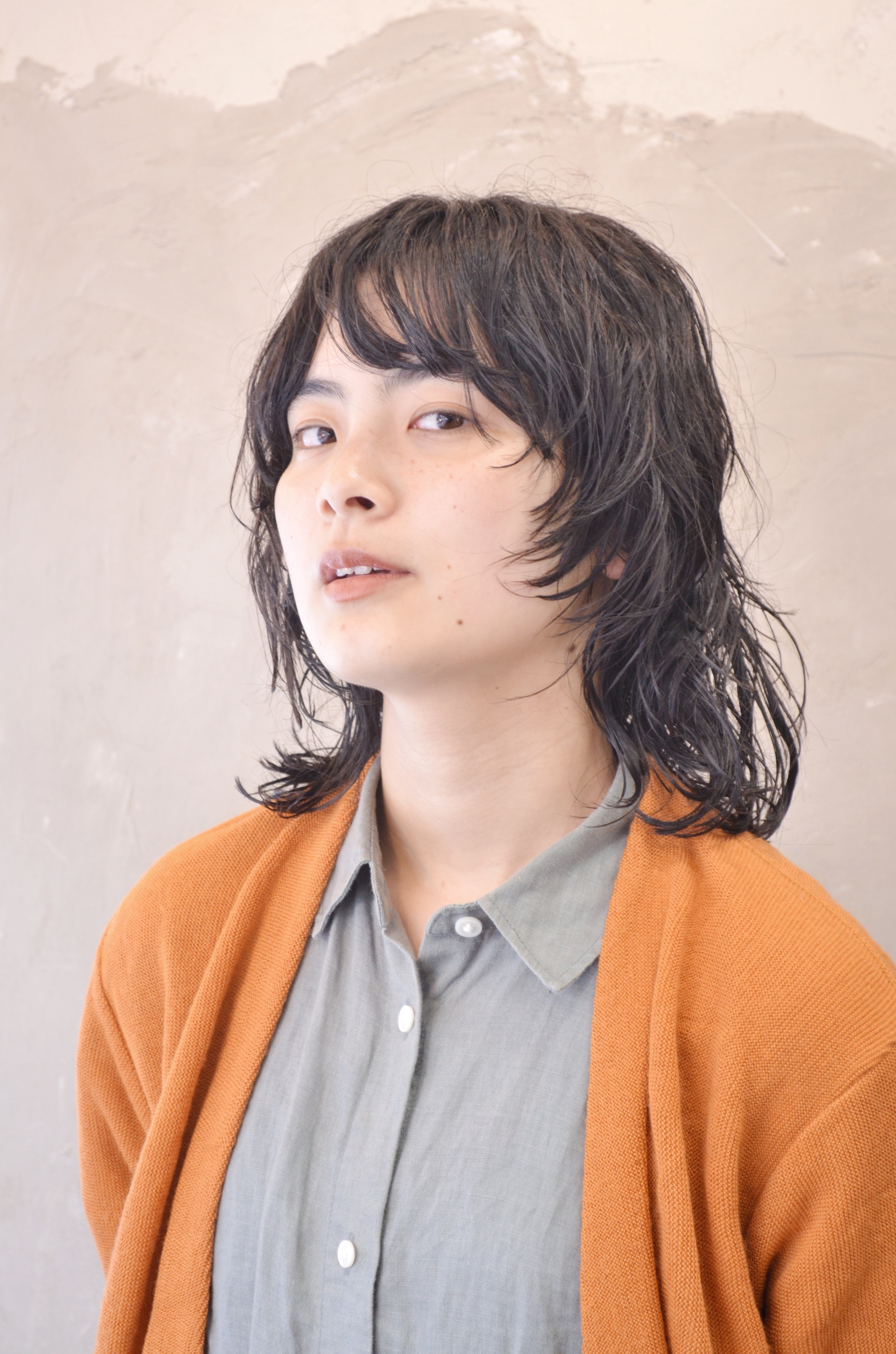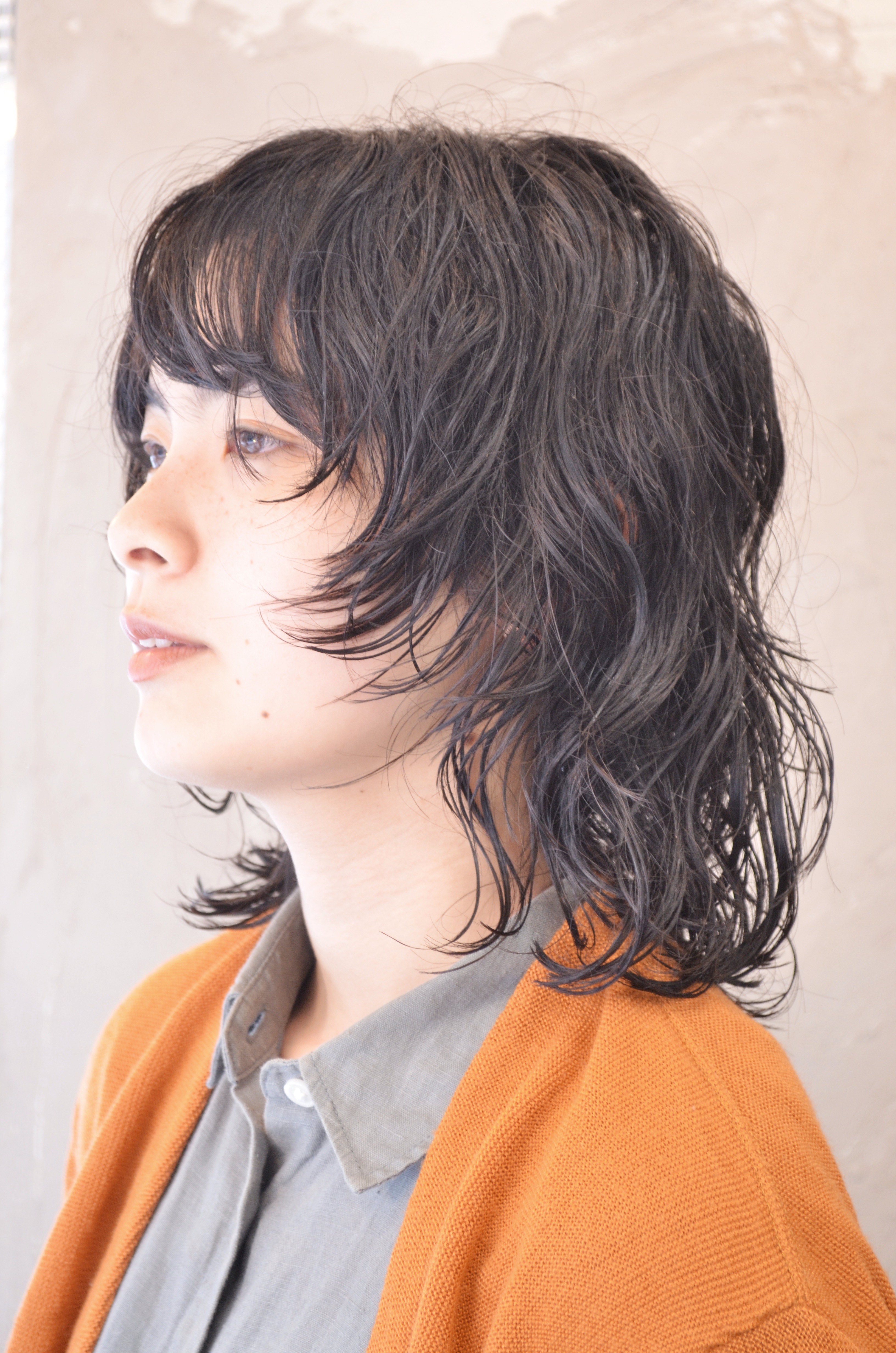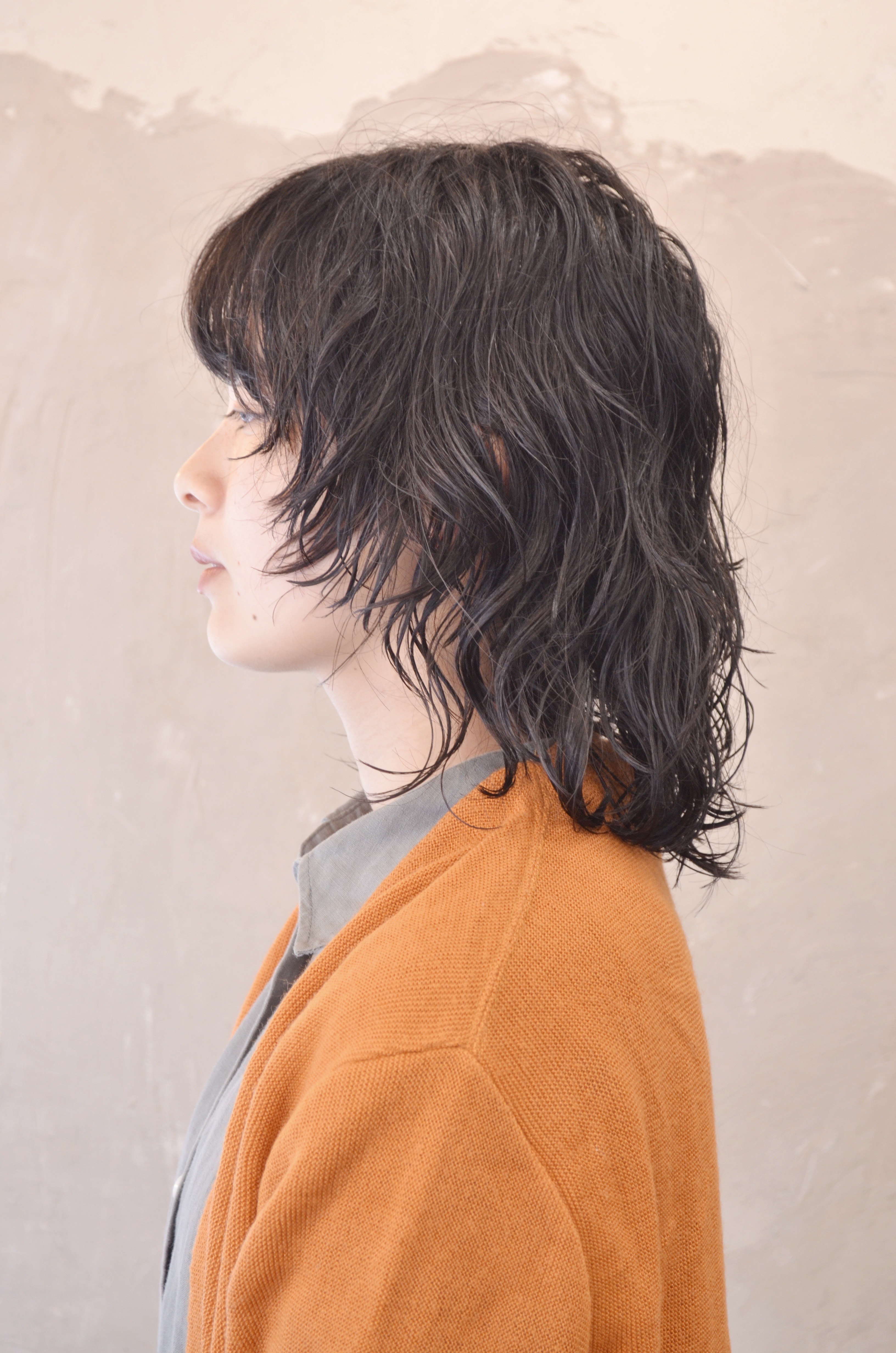 - ミディアムウルフレイヤーにニュアンスパーマをかけたスタイルです。